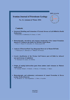 گل فشان ها، ساختارهای زمین شناسی ناشی از خروج گاز، گلآب و خرده های سنگی با ابعاد مختلف در مناطق خشکی و ساحلی با مرفولوژی های متفاوت و نشانگر حرکت پوسته ای و فعالیت تکتونیکی امروزی هستند. گل فشان های زیادی در منشورهای برافزایشی مکران ایران و پاکستان گزارش شده است که به دلیل برخورد صفحات هند و اوراسیا تشکیل می شوند. در این مطالعه، منشا گازهای هیدروکربوری گسیل شده از سه گل فشان فعال عین، بربروک و سندمیرسوبان در سواحل خشکی مکران ایران بررسی شده است. گازهای خارج شده از این گل فشان ها عمدتا متان با غلظت بین vol.% ۱۸/۹۹-۲۴/۹۷ و مقدار کمی اتان (vol.% ۲/۱-۰۴۸/۰)، پروپان (vol.% ۱۹۴/۰-۰۰۱/۰)، ان-بوتان (ppmvol.% ۲۲-)، ایزوبوتان(ppmvol.% ۳۶۳-۵)، ان-پنتان (ppmvol.% ۳۷)، ایزوپنتان (ppmvol.% ۶۶-۱)، هگزان (ppmvol.% ۷۸-۱) و دی اکسیدکربن (vol.% ۴/۰-۰۷/۰) هستند. مقادیر نسبت ایزوتوپی کربن و هیدروژن متان و دیگر گازهای هیدروکربوری نشاندهنده ی منشا ترموژنیک گازهای خروجی از گل فشان های مورد مطالعه است و شواهدی از عدم تجزیه زیستی را نشان می دهند. دی اکسیدکربن نیز با نسبت ایزوتوپی کربن ۱/۱۱- تا ‰ ۳/۱۴- دارای منشا آلی است. نتایج این مطالعه، حضور سیستم های هیدروکربوری و سنگ منشا فعال را در این ناحیه تکتونیکی فعال نشان می دهد. اگرچه حضور مخزن گازی در این منطقه بایستی توسط مطالعات ژئوفیزیکی، زمین شناسی و محیط های ساختاری تایید شود.